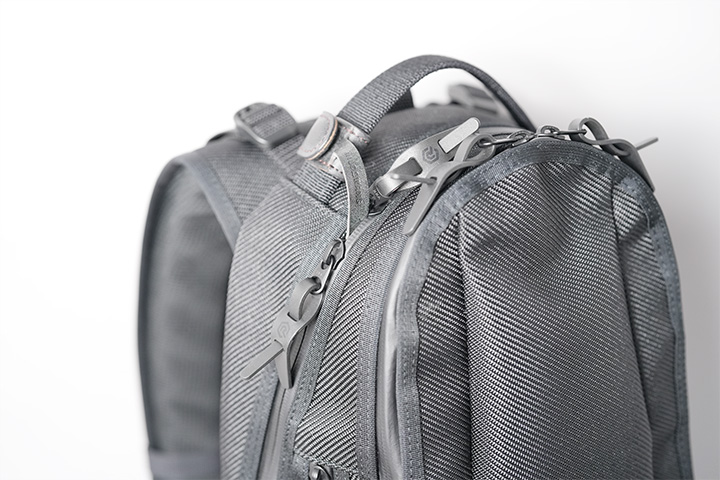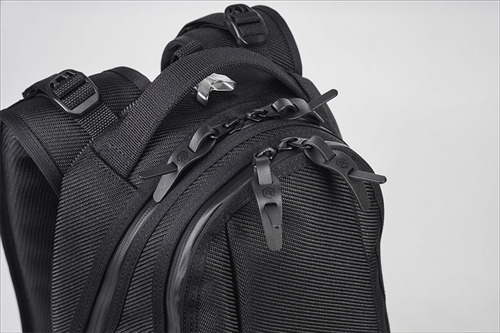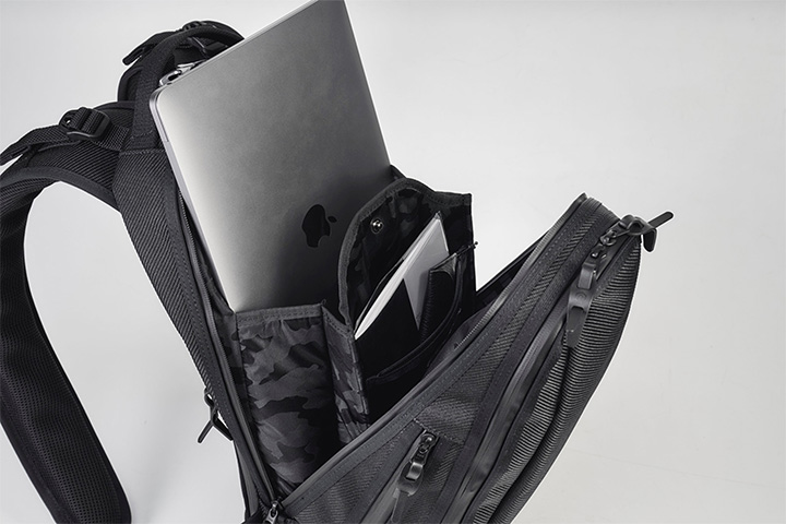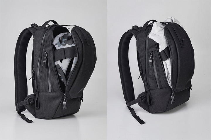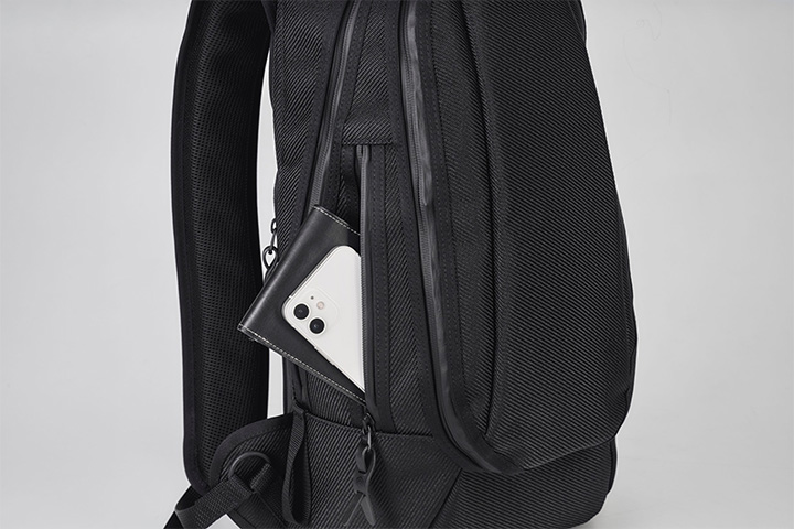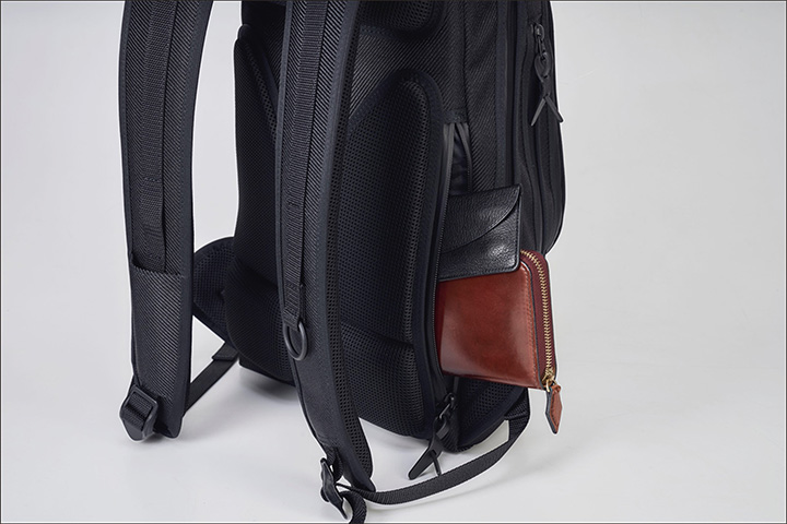 バックパックを背負った状態の密着により、盗難等を防止するよう、外側からは収納物を取り出ししにくい仕様になっています。