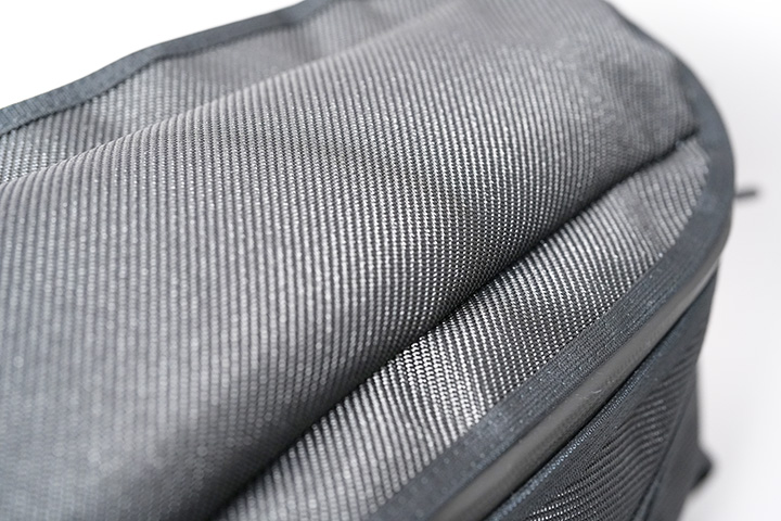 直接体に触れる背面クション部及び、ショルダーベルト裏に使用している生地は、柔軟性に優れ、体にしっかりとフィットしながらも、通気性の良い、日本製 “メッシュ生地(ポリエステル100%)” を使用しています。