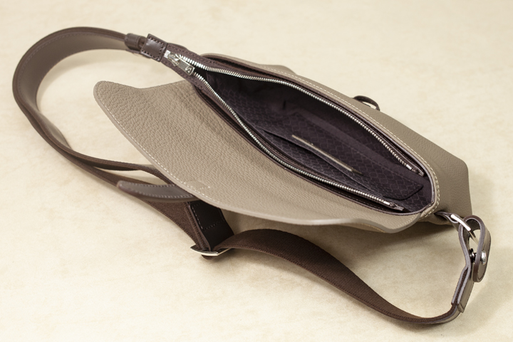 外装にドイツ・ペリンガー社のシュランケンカーフを用いたこのショルダーバッグは、軽量で身体にフィットして全体のシルエットを崩さない特性により、手ぶらに近い感覚でお財布やスマートフォンといった小物類を持ち運ぶことが出来ます。