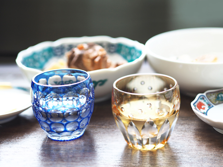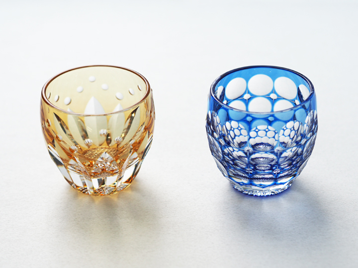 こちらの2つは伝統工芸士である鍋谷聰(なべたにさとし)氏による精緻な江戸切子の加工と、色被せ(いろきせ)による色彩が見事に調和した美しい冷酒杯です。