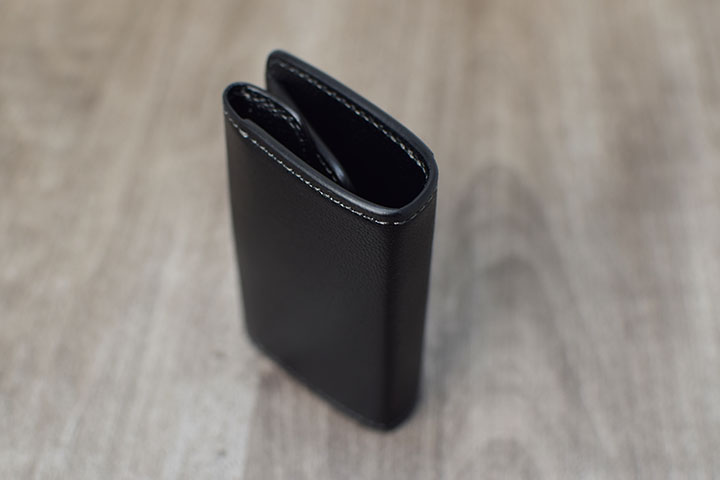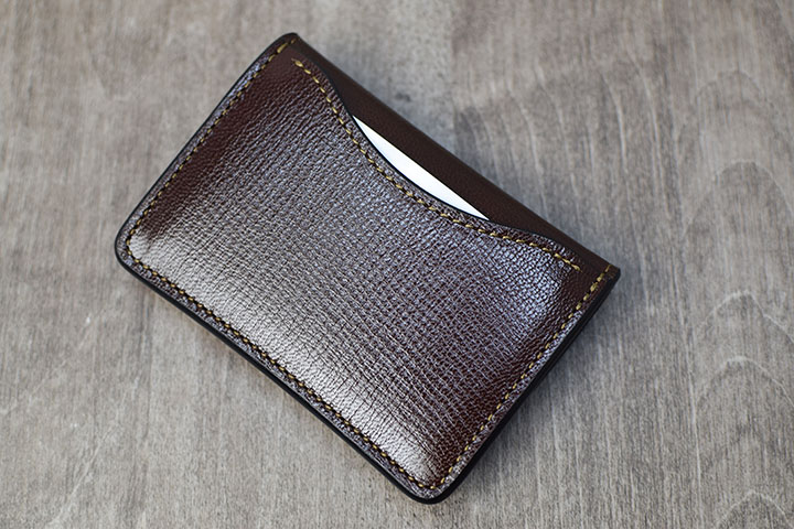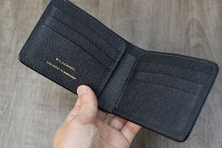 2辺綴じのカード収納に、落下を心配されるかもしれませんが、内装の型押しサドルプルアップは十分なハリ感が備わっているため、余程のことがなければ、カードが落下することはありません。