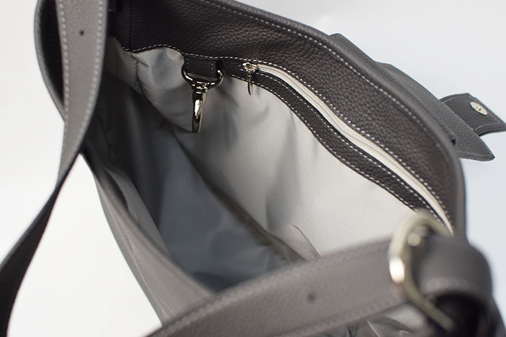 手帳、ポーチ、ペットボトル、折りたたみ傘などを収めることが可能で、外観からは想像できないほどの収納力を備えています。