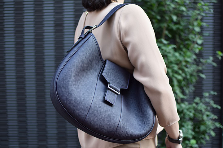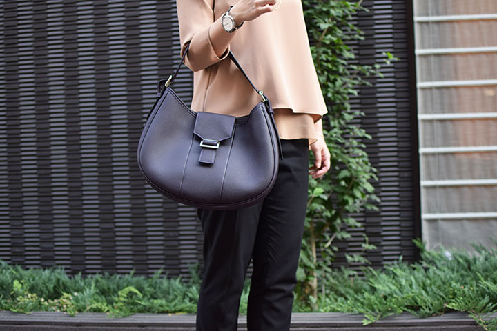 底面からトップにかけての優雅な曲線と特徴的なフラップでシンプルながら独特の存在感を放つレディースバッグです。