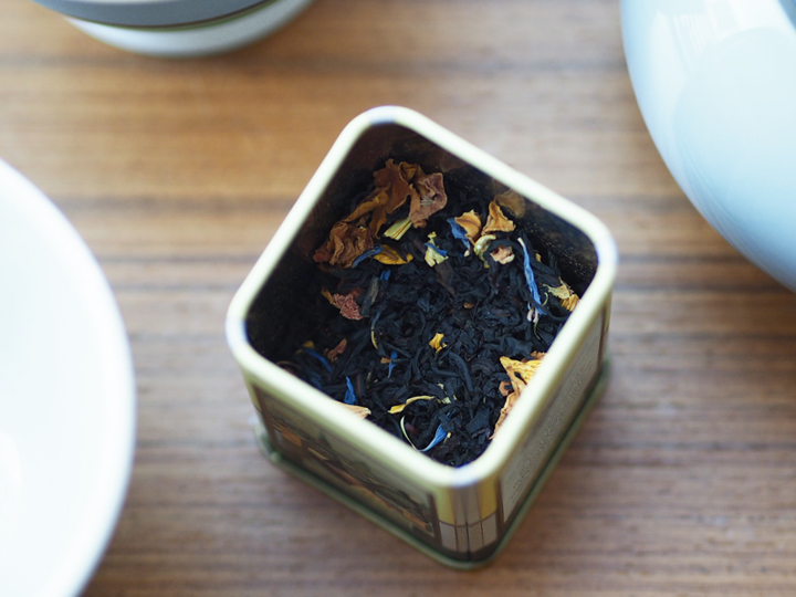お店の屋根にあたる缶の蓋を開けますと、たちまち甘く芳醇な香りがフワッと立ち上がります。気分転換をしたい時やリラックスしたい時などは、もうこれだけで幸福な気分に浸れます。お茶を淹れる前の、何ものにも代え難い至福の時間です。