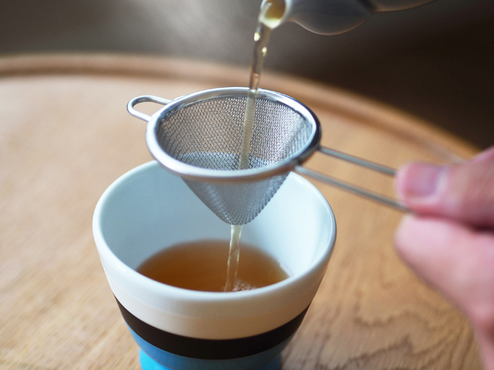 ④ポットの中をスプーンで一回ししてから、茶漉しで漉しながらお茶の濃さが均一になるようカップに注ぎ分けます。