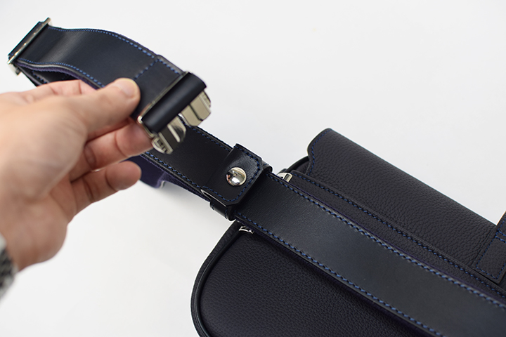 シルバーのバックルを右側の金具に通し、ストラップを折り畳むとウエストポーチにちょうど良い長さとなりますので、こちらで腰に巻きつけます。