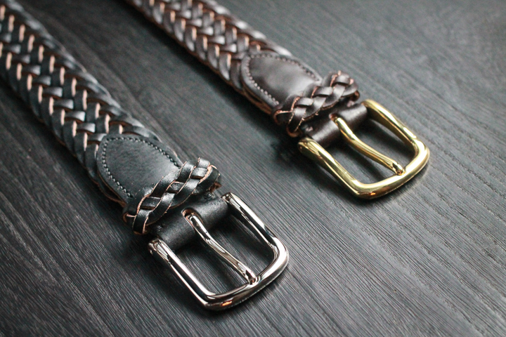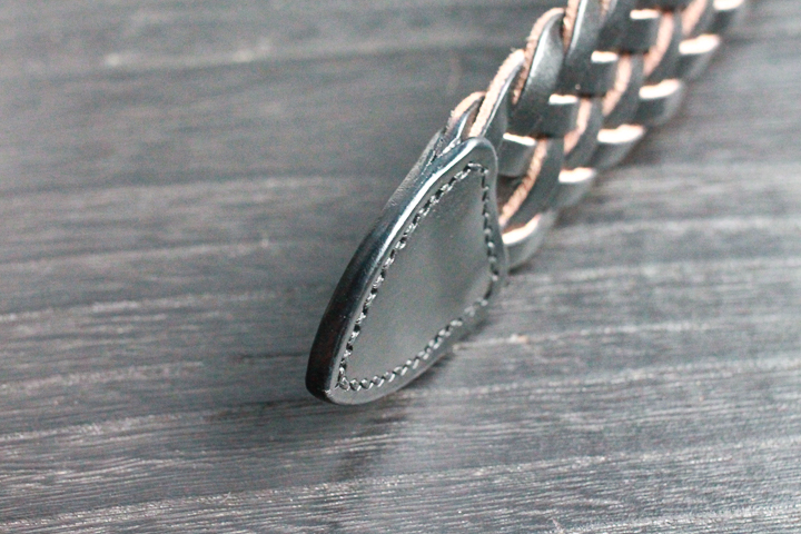 ベルト部分は9本のレース状にした革を一目ずつ編み込んで製作されております。