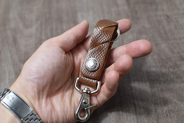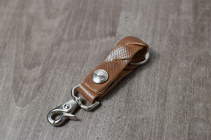従来からスムースのシェルコードバンでBRAIDを製作しておりましたが、今回型押しのシェルコードバンになったことで強いハリ感が備わり、これまでのBRAIDとは趣の異なるキーホルダーとなりました。