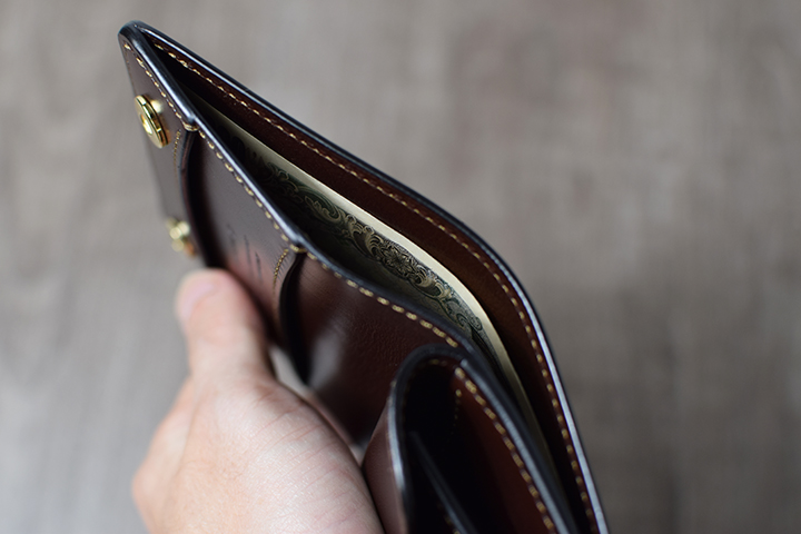 また、紙幣を多く入れた際に紙幣が本体からはみ出ないように、札室の上側のラインが中央にかけて緩やかに山なりになる形状となっています。