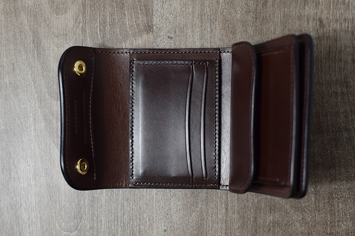 ゴールドカラーのホックを外すとホーウィン・シェルコードバンRUSSIA/HATCHを使用したコインケースの前胴部分が現れます。
