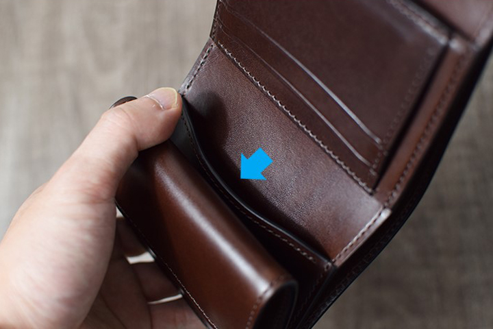 こちらにも革の仕切りが付いているので、手前にコイン、奥にカードが収まります。
