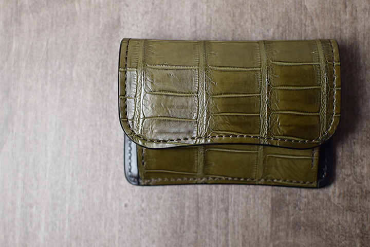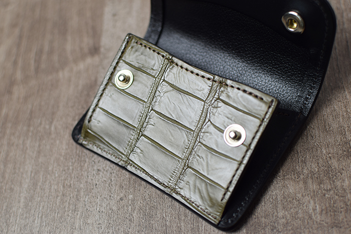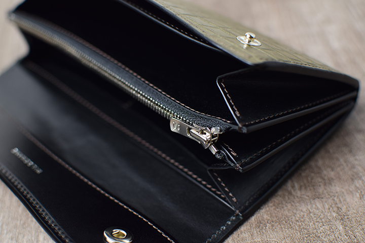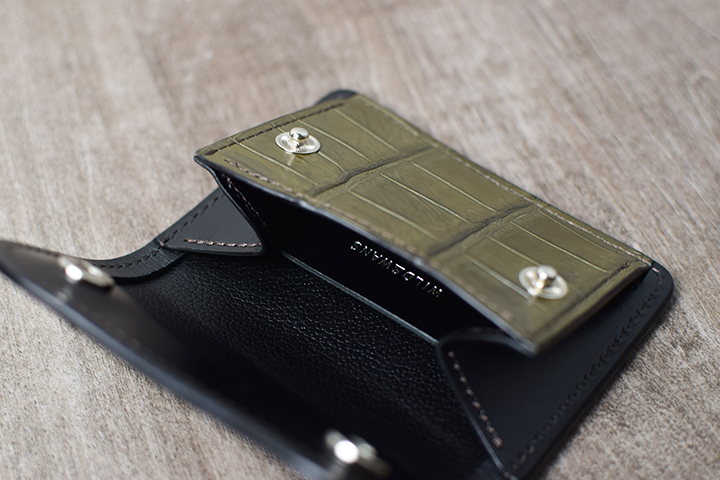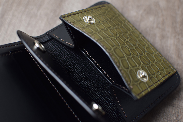 前胴にカーキのポロサスを用いたコインケースはたっぷりのコインが収納できる他、TONGUEと同様に内部に革の仕切りを設けているので、こちらにもカードを収納して頂けます。