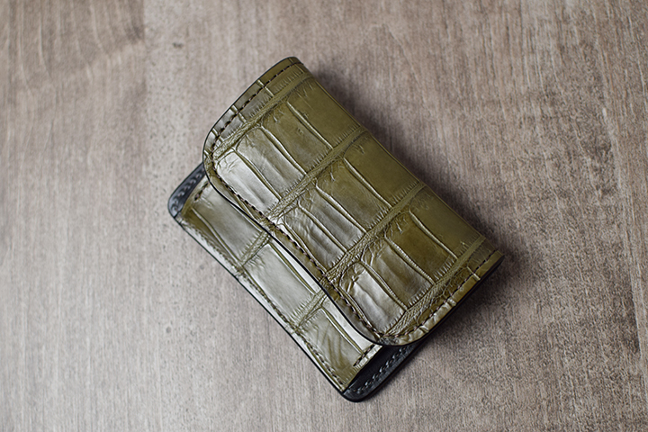 定番品のクロコダイルを用いたTONGUEはフラップと背面のカードポケットだけにクロコダイルが使われていますが、今回のポロサスTONGUEではフラップを開けた前胴部分にもポロサスが用いられるとても贅沢な仕様です。