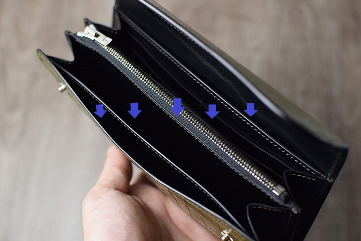 前胴革の手前と一番奥はマチなしのスペースで紙幣や領収書などの収納に適しています。