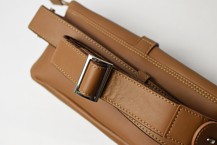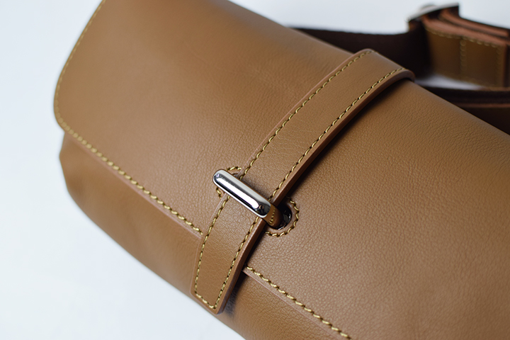 ミニマルな外観のボディですがシルバーカラーの金具を通したフラップ中央の革のストラップが印象的です。