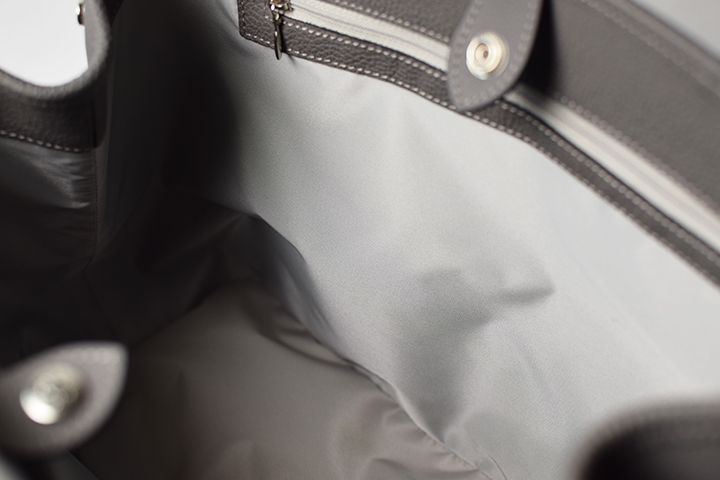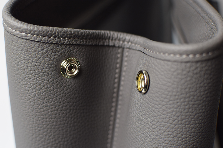 本体両サイドのマチ部分にはホックが設けており、荷物が少ない時はコンパクトにマチを折り畳み、荷物が多い時はホックを外してマチを開放するなど、中の収納量に応じて形に変化をつけることができます。
