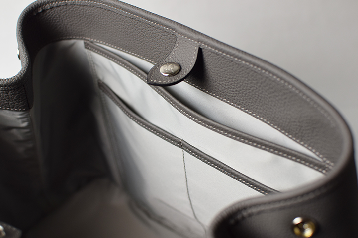 内装には2つの異なる仕様の内ポケットを備えています。どちらもキーケースやパスケース、その他アメニティアイテムといった細かなアイテムの収納に適しています。