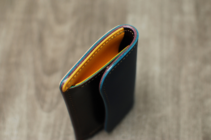ナチュラルカラーや、ブッテーロなどの極めて明るいお色味を使用している製品のコバにもご注目下さいませ。黒い染料は入っておりませんが、こちらもしっかりと磨かせて頂いております。特にカラフルな革を組み合わせて制作した製品のコバは、革のパーツが幾重にも重なっていることが実感でき、その色の鮮やかさが顕著にくっきりと反映されており、一点一点異なる表情を見せてくれます。なんとも言えない個性的な表情に引き込まれてしまいそうです。WILDSWANS製品の醍醐味といえるこのコバは、この染料を入れない「素磨き」仕上げでもしっかりとご堪能頂く事ができます。WILDSWANS製品をお手に取っていただく際には、改めてコバの表情にもじっくりとご注目いただけますと幸いです。