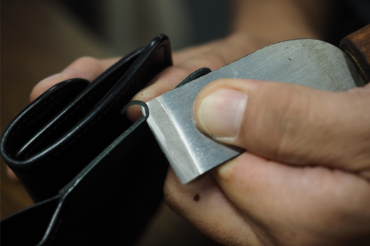 製品表面の皮革のお手入れはさることながら、コバもお手入れを加えることで、顕著に応えてくれます。使い込んでいただいたお品物ほど、お手入れ後の滑らかさが癖になってしまうかも知れません。殆どの革小物に付属しているスリッカーは、お客様にお気軽にご自宅でもコバのお手入れをしていただけます様ご用意しておりますが、詳細なご使用方法や、頻度に関してのご質問をお受けすることも少なくありません。上記のような要領でご自身でもお気軽に、コバのお手入れをお愉しみいただけますが、お近くにお越しの際は、是非一度、実際にご使用方法やお手入れの流れなどをご覧いただきながら、お客様の目で、手で、体感していただきたいと思います。