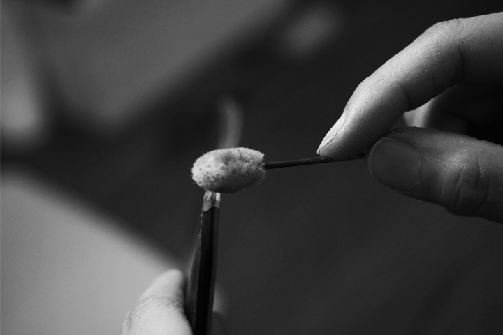 こちらは染料を入れる前の仕込みの様子です。手作業で丁寧に角を取り、丸みを付けながら研いでいきます。技術と根気が必要な作業です。この絶妙な丸みと曲線は外観の美しさを生み出すだけでなく、壊れにくい道具を作るのに重要なポイントといえます。世の中で一番壊れにくい形状は「球体」といわれているからです。角のある部分は、外部からの衝撃を受け易く、そこから壊れてしまいがちな為、使用過程で製品が傷みやすくなる原因のひとつとなりますが、角をできる限りなくすことでダメージを軽減することができます。