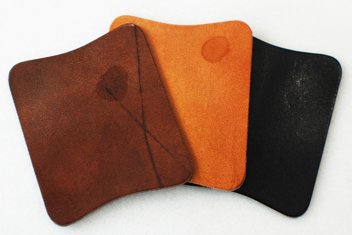※上記画像は各色の防水スプレーを施していない革に水滴を垂らし、自然と染みこませ、その後数時間放置した際の水染みの様子でございます。水分量や、水濡れ時の状況によってもシミの程度は異なります。左から、ダークステイン、ロンドンカラー、ブラックでございます。