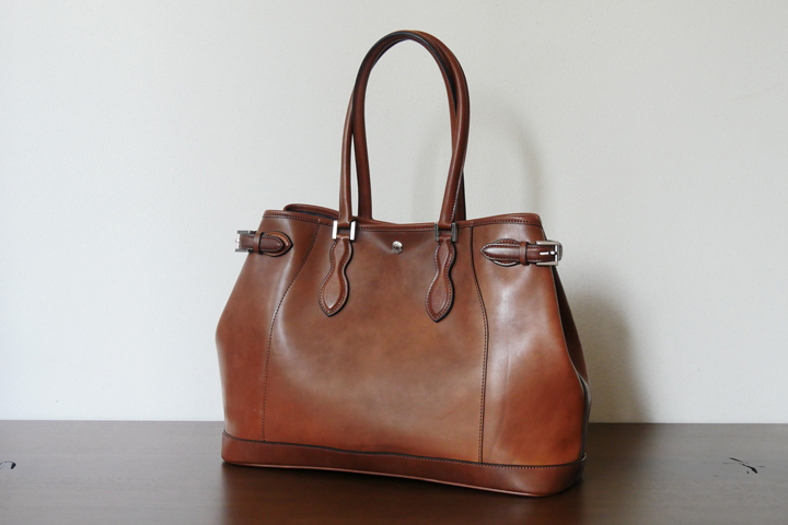 約2000年も前から続いていると言われている伝統的な技法が特徴で、1年以上の長い歳月を重ねて鞣す事により、繊維密度が高まり、非常に耐久性に優れた革へと仕上がります。また、加油、加蝋、染色を施す過程で、ギン面(革の表層)を一切削らない手法を採用しているため、とても頑丈な皮革です。革の中で一番強度の高いギン面(グレイン)部分を活かした『フルグレイン仕様』が、一般的なブライドルレザーと大きく異なる点でございます。