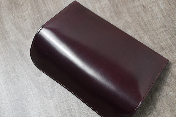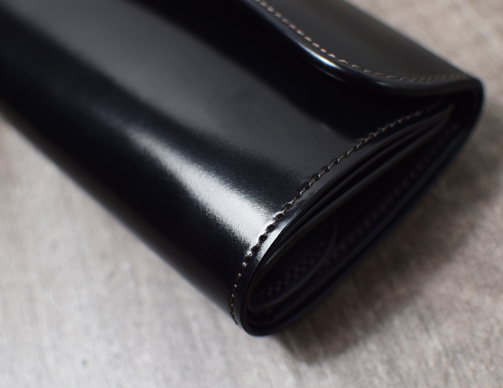前回ご紹介したENOを一回り大きくした三つ折り財布のBYRNEも長財布と二つ折り財布の中間に位置するアイテムです。繋ぎ目のない表の大きな板面部分が全てシェルコードバンです。