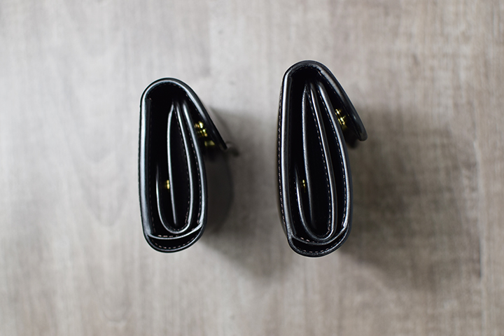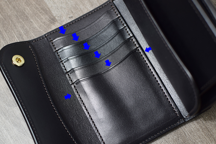 一番手前(前胴側)と一番奥(背胴側)はマチなしのスペースで、紙幣や領収書などの収納に適しています。