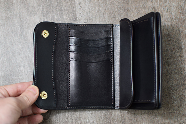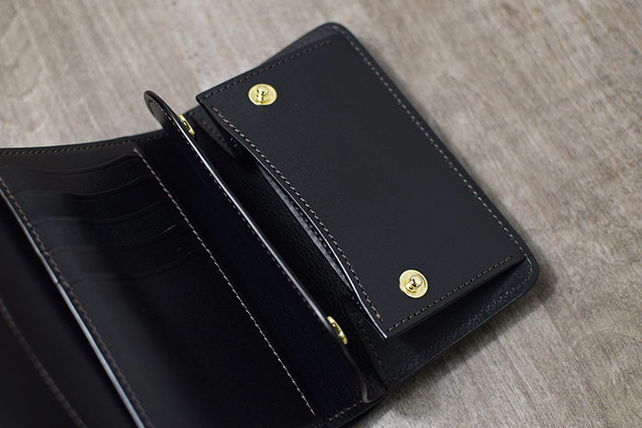 コインケースもひと際大きな作りですが、こちらもホックにより開閉する仕様です。余裕をもった収納スペースでコインを十分に収納できます。また、ENO等と同様に革の仕切りを設けているので、カード段などに収まりきらなかったカードの収納も可能です。