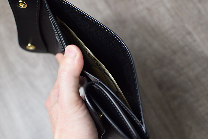 本体のサイドにある札室はその高さが少し深くなりますが、開口部が大きく開き、札室内部も革張りが施された仕様のため、視認性を確保しながら取り出しがスムーズです。