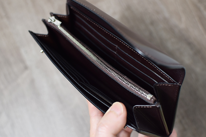 前胴とフラップを開くと内装が現れます。フラップを左に置いて、中央にカード段、右にコインケースが整然と配置されています。
