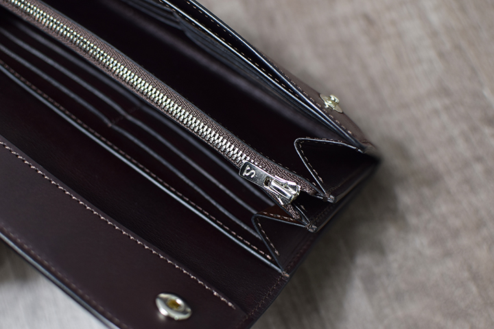 とても大きなコインケースですが、片マチ式でスムーズな出し入れを実現しています。
