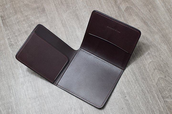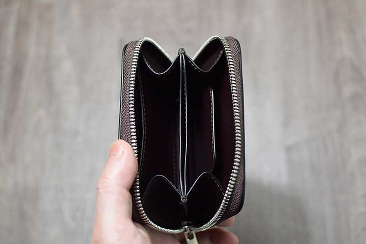 フラップの裏側に当たる内装部分は1列2段のカード段とマチなしの札室収納部で構成されています。