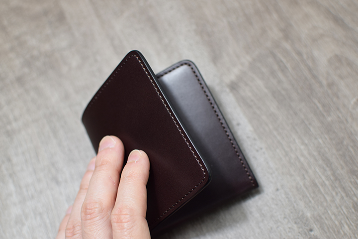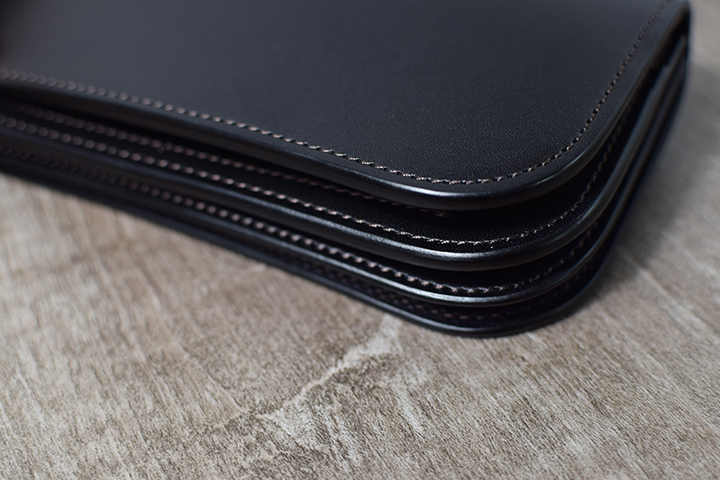閉じた際の厚みは約25mmとなり、非常に肉厚でボリューム感のある長財布です。4層から成るWILDSWANS製品のなかでもとりわけ分厚いコバ(=革の断面)の連なりは圧倒的な存在感があります。