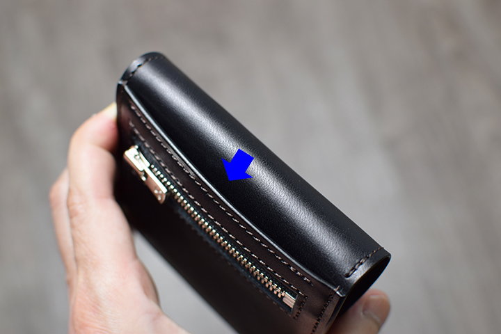 もう一方のロゴが入らないポケットは「あおりポケット」と呼ばれる特殊なポケットです。 パーツの2辺のみをL字でなぞるように本体と繋ぐ、主にカードを入れる収納スペースです。イングリッシュブライドルが持つ革自体のコシの強さにより収納したカードをクリップのようにホールドするため出し入れが非常にスムーズで容易にカードが落ちることもありません。