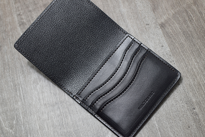 内装に目を向けると右側にWILDSWANSのロゴが刻印された3段式のカード段が現れます。こちらのカード段にはWILDSWANSらしい優雅な曲線が用いられています。