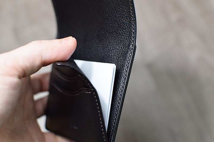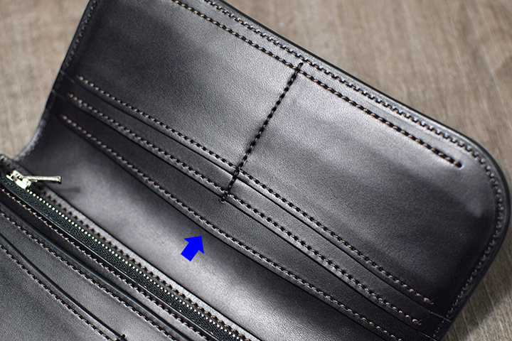 カード段の後ろはMORRISと同じ2辺をL字でなぞるように留めた「あおりポケット」です。そして、紙幣を入れることでこちらがそのまま札室となります。MORRISより多くの革のパーツ用いているため、より強力なホールド力が備わっています。