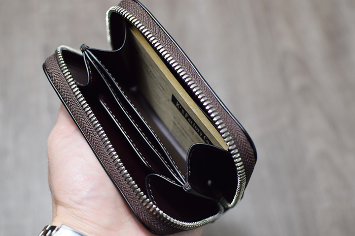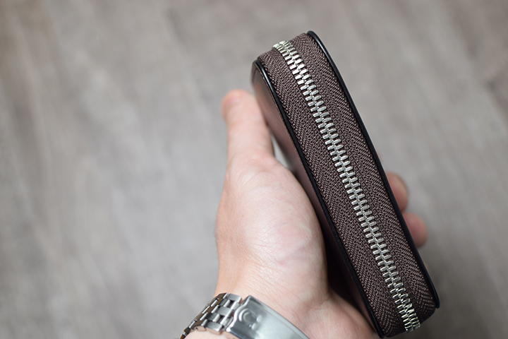 ラウンドファスナー式のLAFAROは手のひらサイズのコンパクトなモデルですが、20.5mmの厚みのボディで見た目以上の収納力を備えています。