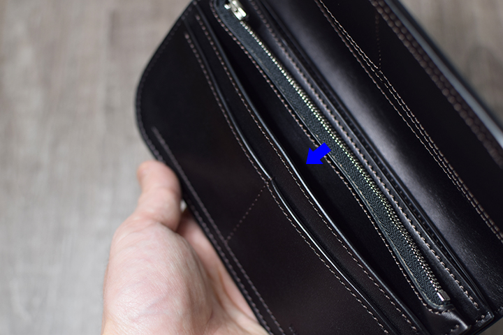 外装の背面にはファスナー式のコインケースを備えています。小振りのコインケースですが片マチ式で取り出しやすさにも配慮された設計です。(こちらに沢山のコインを入れてご使用されますとファスナー故障の原因に繋がる可能性がありますのでどうかご注意くださいませ。)