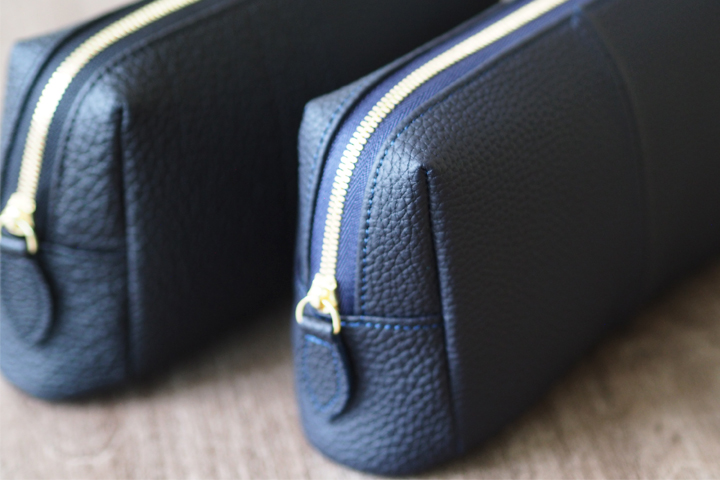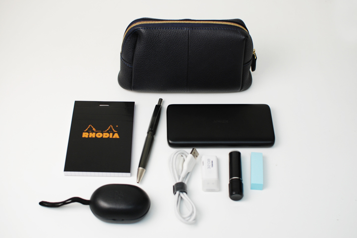 こちらは実際にスタッフが使用しているシュランケンカーフRUELLEのネイビーです。 中に収納しているモノはリップクリーム、ハンドクリーム、オードパルファム、目薬、眼鏡クリーナー、フリスク、WAXといったエチケット用品を中心に7点が入っています。