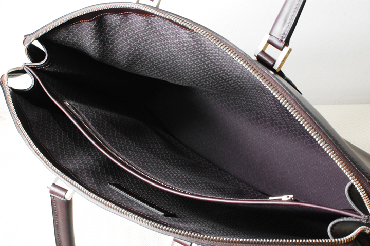 内装は中央で仕切られた2室構造です。 中央の仕切りはしなやかで左右どちらにも寄せることが出来ますので、厚みのあるものも仕切りに阻まれずに収めることが出来ます。