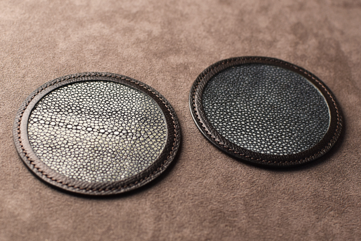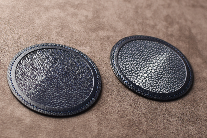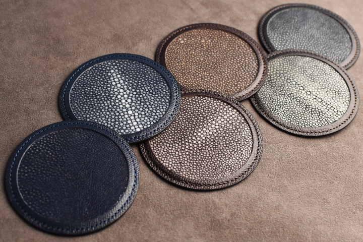 ガルーシャ(エイ革)と型押しを施したイングリッシュブライドルレザーを使用した革製のコースターが入荷いたしました。