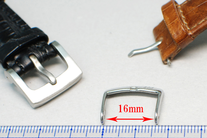 (3)WATCH STRAPのサイズ表記は「19-16」のように2つの数字が対になった表記です。 1つ目の数字がラグに接続される部分のベルト幅で、2つめの数字がバックルに接続されるベルト幅を表しています。
