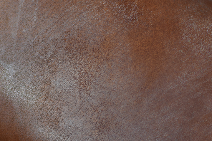 フルグレインブライドルレザーは、一番強度が強いとされる皮革表面(=ギン面)を削らずに仕上げるため、原皮段階が残るキズ、シワ(トラ)、血筋、シミ等がそのまま残ります。また、同時にブライドルレザーならではの白いロウ分(ブルーム)が現れることも珍しくなく、スモーキーでワイルドな風貌はまさに圧巻です。