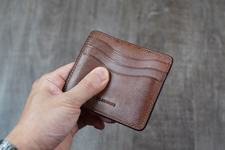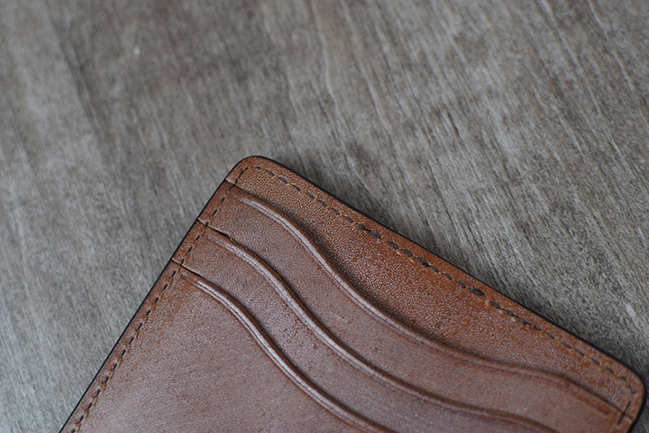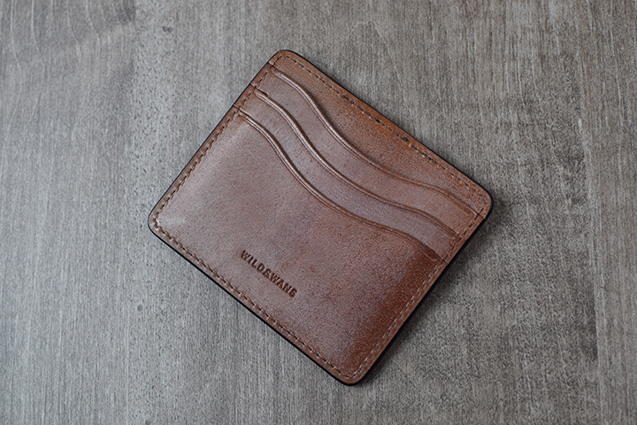 MINIMALのもう一つのバージョンでは、アメリカ牛革のイングリッシュブライドルレザーを用いて製作しました。イングリッシュブライドルレザーは、アメリカのペンシルバニア州のウィケット&クレイグ社が製造するブライドルレザーです。ウィケット&クレイグ社も100年以上の長い歴史を持つタンナーで、良質な皮革を世界中に供給しています。イングリッシュブライドルレザーは、ウィケット&クレイグ社を代表する皮革の一つで、選りすぐりの北米産原皮を自社のピット槽で長い時間を掛けて仕上げるフルベジタブルタンニン鞣しのブライドルレザーです。