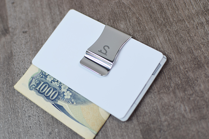 本体と接続した状態では、画像のようにオリジナルクリップに折りたたんだ紙幣やカードを挟みます。