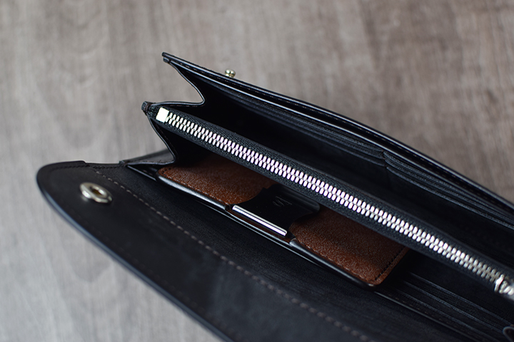 背面にはブランドロゴが刻印された3段式のカード段が付きます。お使い始めにカードを出し入れする際は少々硬さを感じますが、少しずつ馴染んでスムーズになります。パーツの変形を防ぐため、カード段1段に対するカードの挿入は1枚でお願い致します。