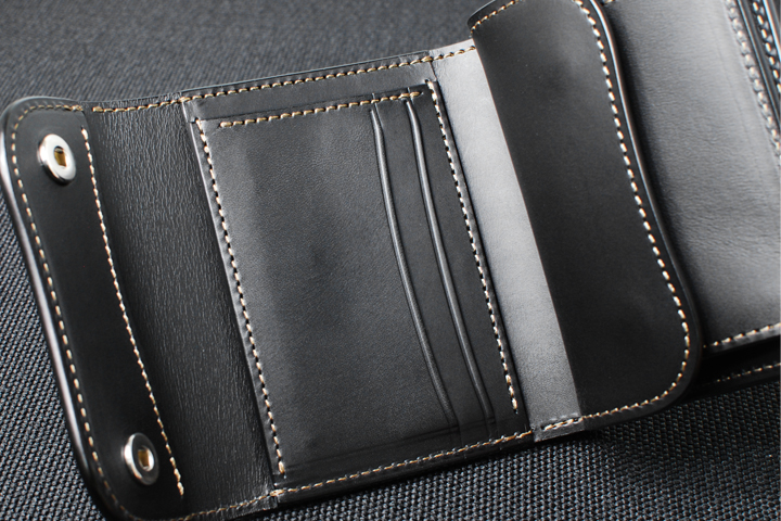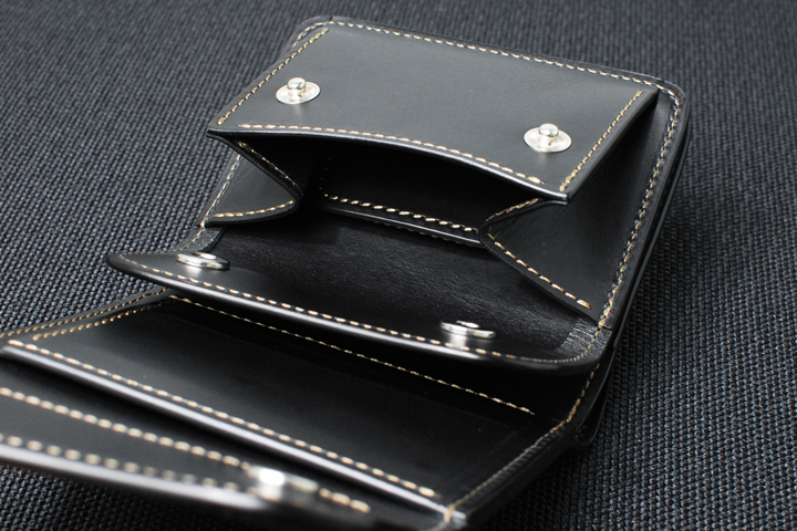 手のひらサイズながら肉厚で堅牢、サイズ以上の迫力を持つ3つ折り財布・ENOです。 コンパクトながら立体的に配された収納部が特徴で、細かな仕分けにも対応した実用性の高いモデルです。