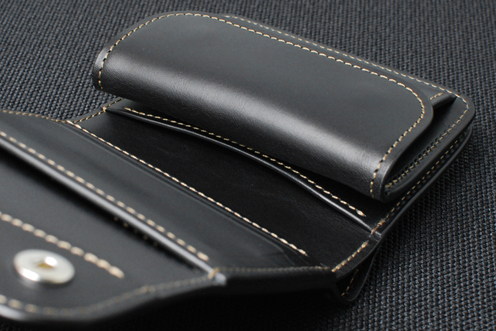 コインケース部分は外装と同様にフラップ式で、2点のホックによって留められています。 ケースは両側にマチを備えたポケットになっており、ポケット内部にはカード類を挟み込んで収納が出来る仕切パーツを備えています。