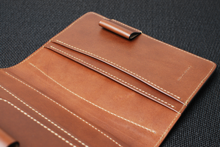 内装はトコ面を見せない総革張りの仕様で、重厚感と高級感があります。 リフィルを挿し込むポケットの他に、左右それぞれの内表紙部分に収納部が設けられています。